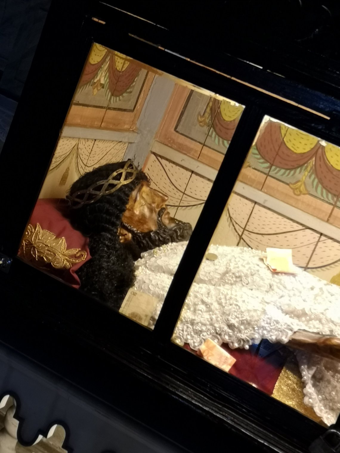 Je me trompe ou ce sont de vrais cheveux qui coiffent les statues ? Au Portugal, rappelle toi les offrandes de cheveux dans la chapelle des os d’Evora.
