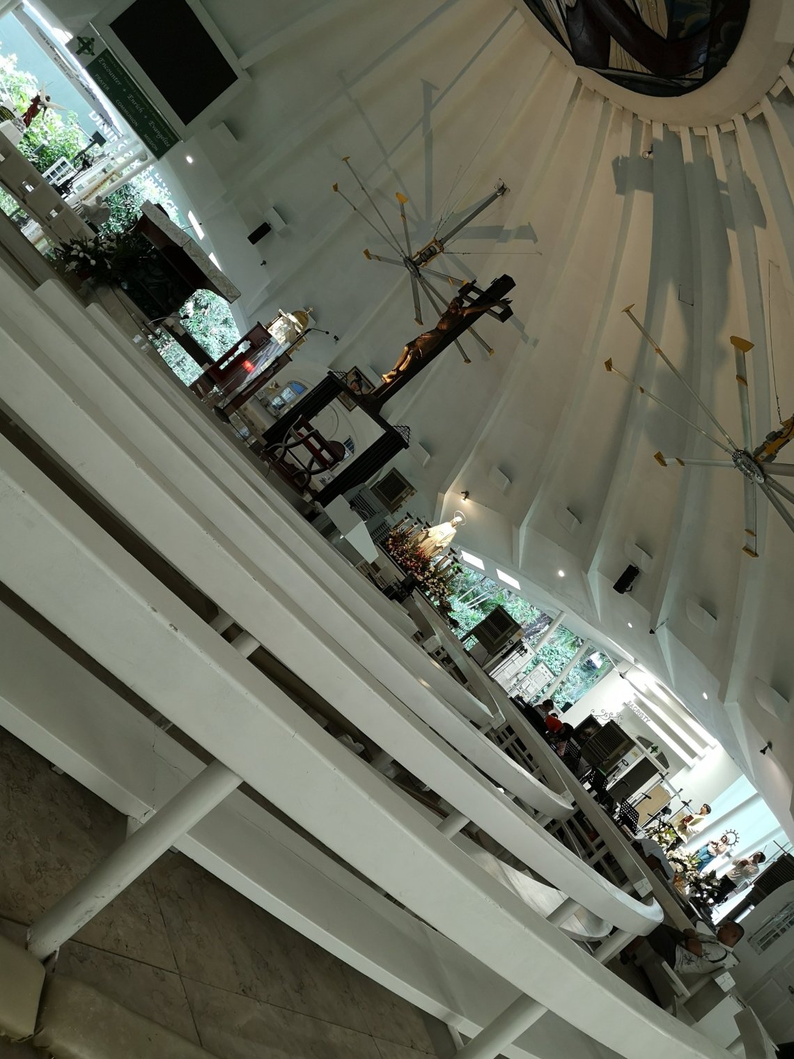 Au milieu de cette green belt, comme le lieu s’appelle, une nouvelle voile de béton arrondie. Là, au milieu des enseignes de grand luxe, il y a l’église ronde de Makati. Au milieu de leur journée, entre 2 emplettes, les philippins viennent prier, ou se confesser, et ils font la queue pour cela.