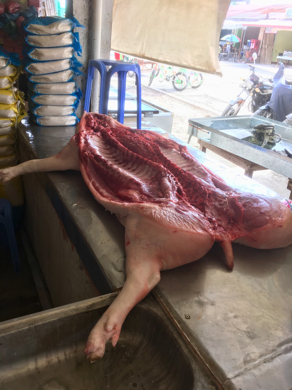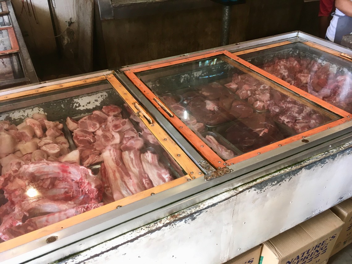 Ensuite on ira acheter le poulet pour l’adobo (plat local de poulet et riz) du soir chez le boucher d’en face, qui est très occupé avec un baboy (cochon), dans des conditions sanitaires tout de même étonnantes pour un européen 😶
