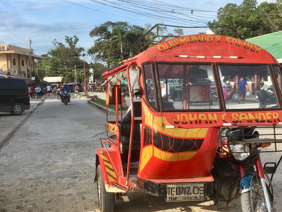 Aujourd’hui départ en moto pour le café et un jus de calamansi (le minuscule citron vert) avant de se mettre à l’eau. On longe des plantations de bananiers, on croise le trafic des tricycles qui s’affairent. Les enfants sont à l’école depuis 7.30 (lever de drapeau).