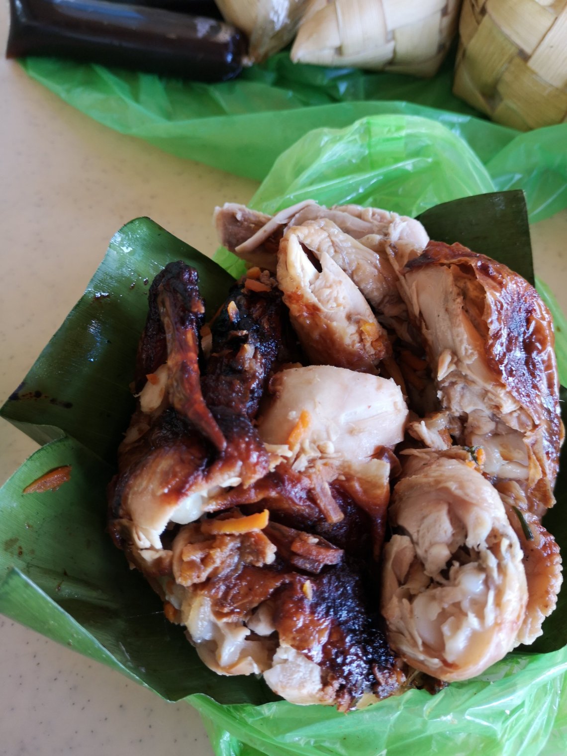 J’ai chopé une sorte de crève qu’une journée à la mer, en étant beaucoup dans l’eau sans boire assez n’a pas arrangée. Hier soir j’avais de la fièvre, c’est pour ça qu’il n’y a rien eu à lire.C’est dimanche, départ pour la plage avec les zenfants. On loue une cabane en bambou avec bancs et table, c’est tout confort pour casser la croûte. Et on est dans une ambiance pinoy (philippine) immédiatement : karaoke à fond tout autour.Pour manger : 2 poulets à la broche et des ballotins de riz (les « puso », ça veut dire coeur, et en effet ils en ont la forme) tellement jolis qu’on a envie de les regarder plutôt que de les manger.