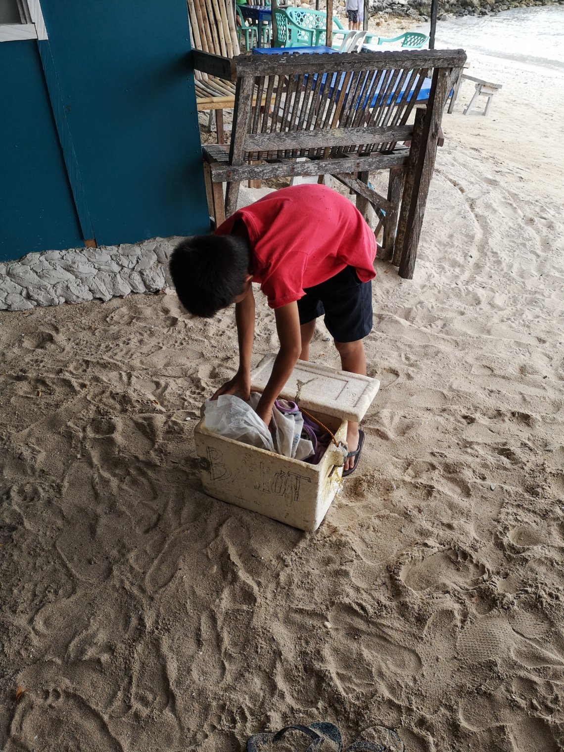 Ensuite rien : la mer comme une piscine, chasser les coquillages et les morceaux de corail.Il y aura une pause glace (des eskimos locaux, vanille ou mangue, transportés à dos d’homme dans une glacière en polystyrène ; appellation « French ice-cream » et la première, l’affreuse pause BALOT, l’œuf AVEC poussin. Pour l’instant je préfère ne pas diffuser de vidéo.