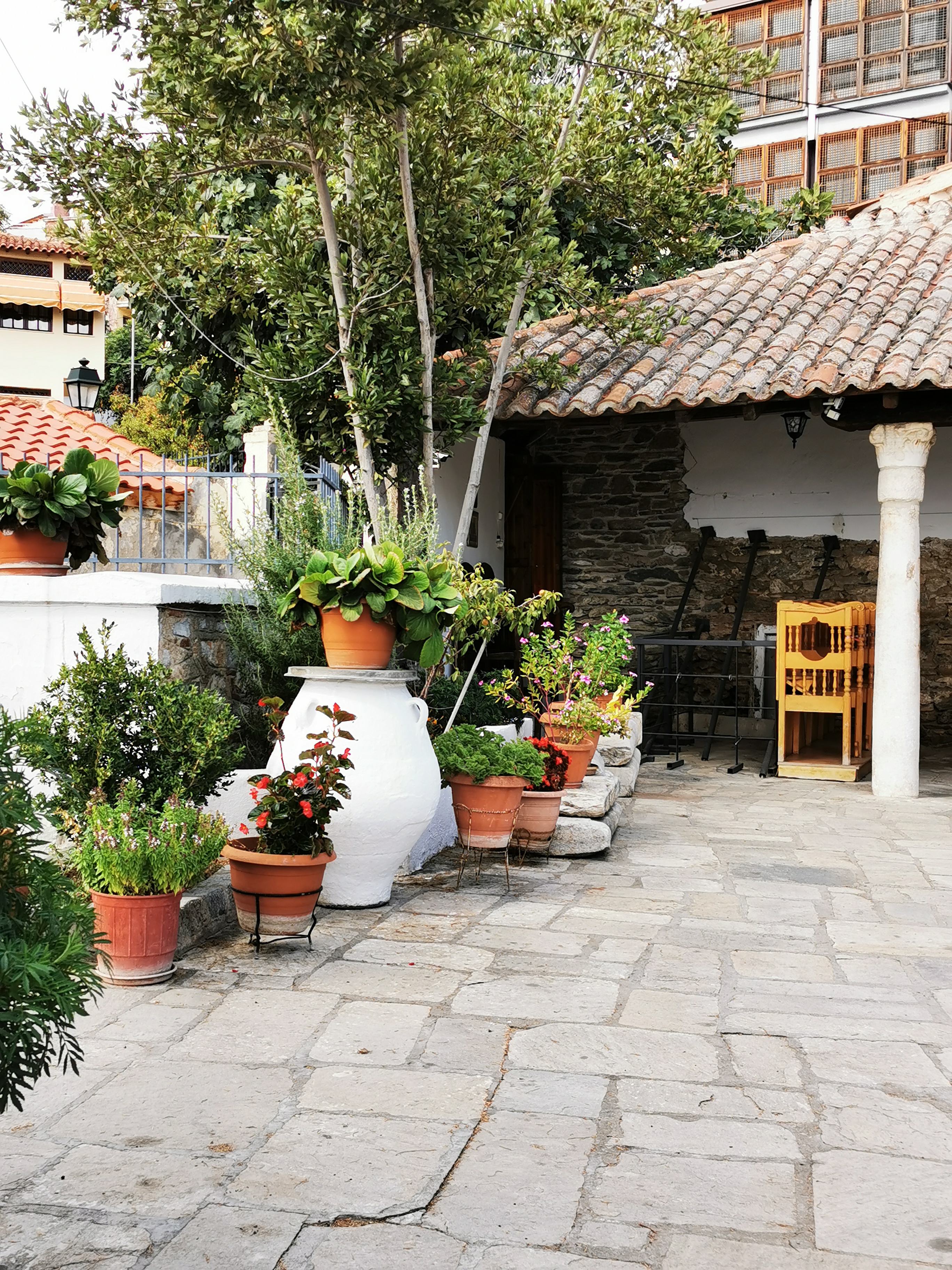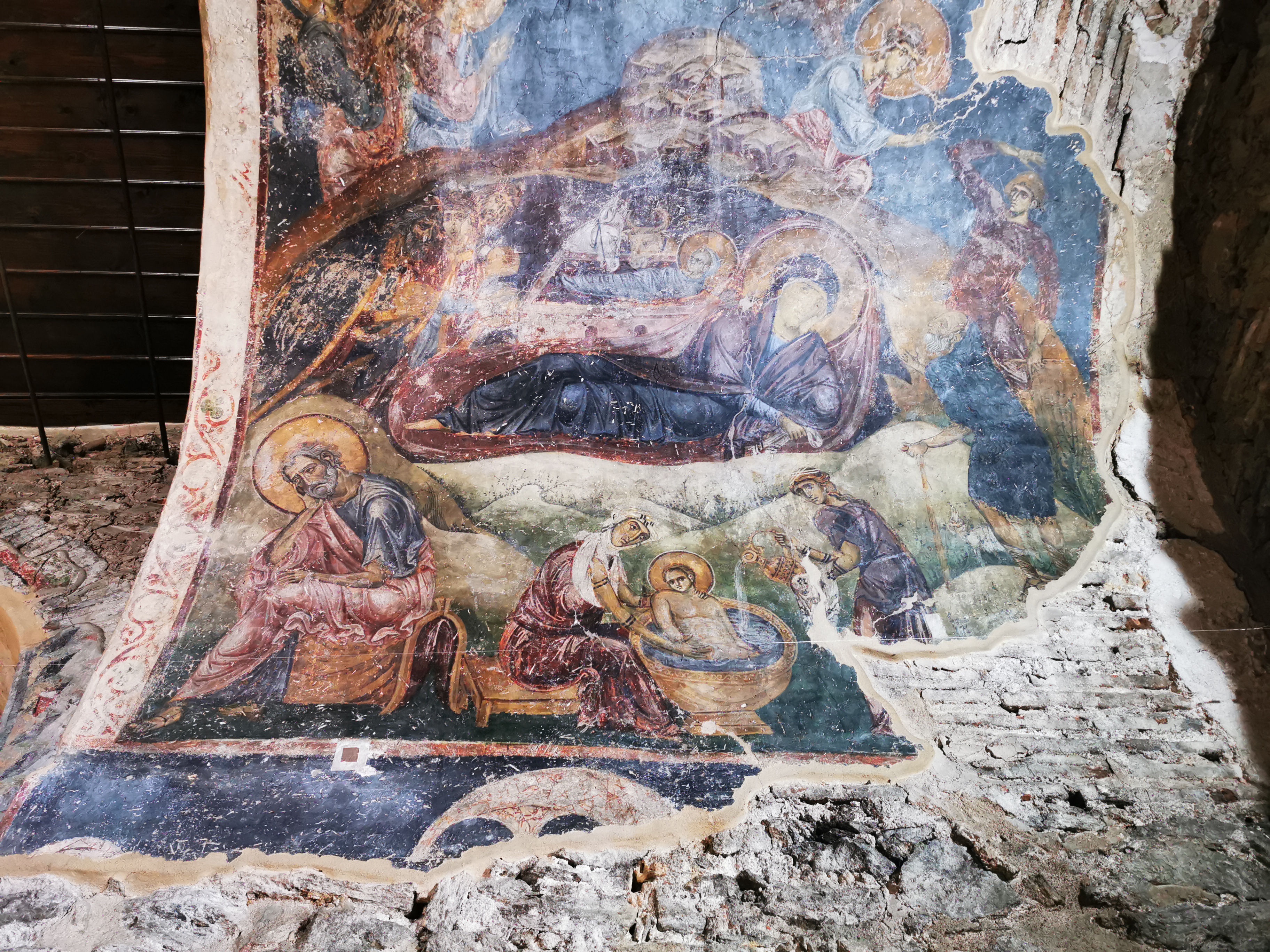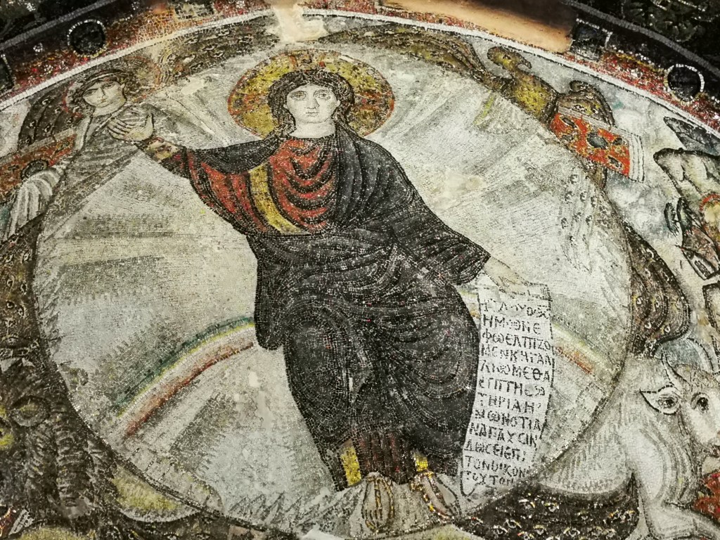 Une merveille de la ville haute de Thessalonique : la minuscule église Osios David qui était le catholicon du Monastère de Latomou. Construite à la fin du 5e siècle sur des vestiges de thermes, elle a été transformée en mosquée. Lors de sa reconsécration en 1921, on a découvert une mosaïque datée de la construction, parfaitement inusitée : le Christ en majesté, entouré du tétramorphe et posé sur les 4 fleuves du paradis apparaît jeune et imberbe. C’est une très ancienne représentation, qui la fait se rapprocher de la très antique image du bon pasteur, toujours jeune. J’ai cru d’abord voir une représentation de la Vierge. Puis, lors des restaurations des années 70, de magnifiques fresques du 12e siècle sont apparues. Une nativité et un baptême.