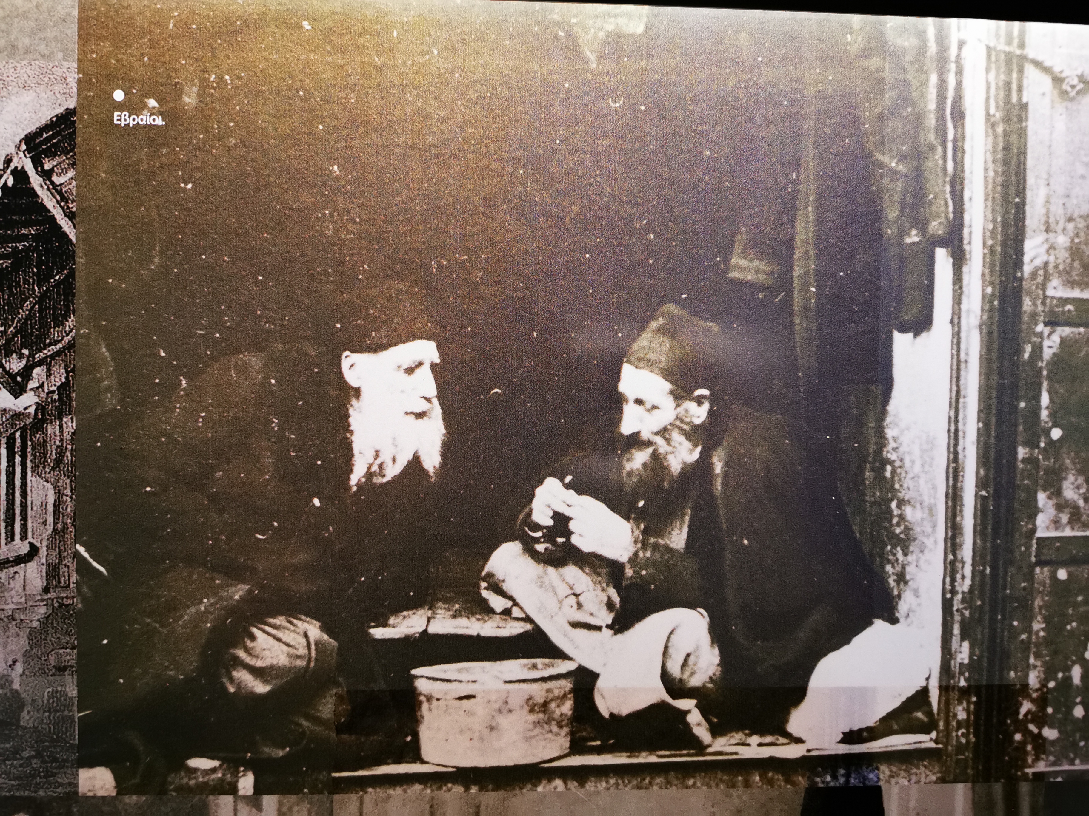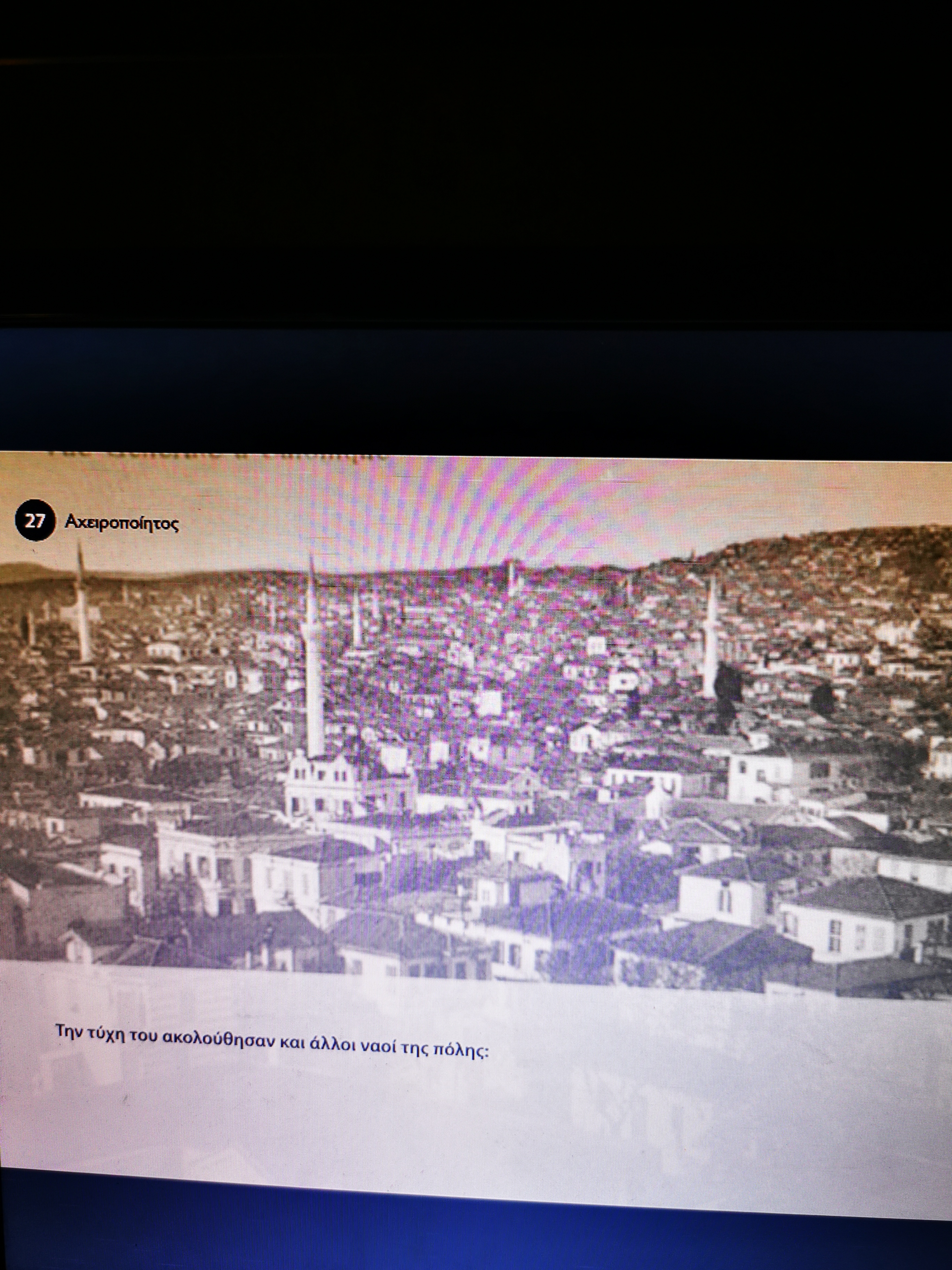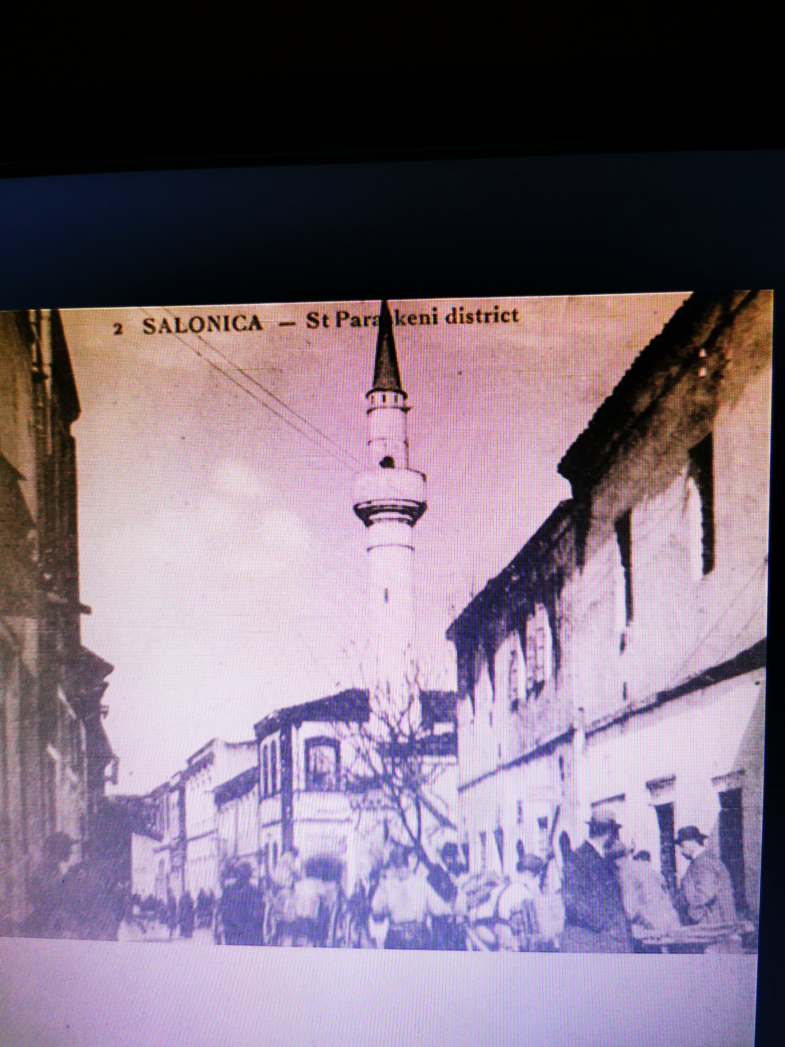 D’abord quelques aperçus historiques de base, glanés ce premier jour. Une ville basse quadrillée, reconstruite par un architecte français suite au grand incendie de 1917. La place centrale (Aristotelous) avec ses somptueux bâtiments d’inspiration byzantine est son oeuvre. Un axe majeur ordonne la ville basse, l’odos Egnatia, la voie antique qui reliait l’Illyrie à Constantinople. C’est toujours la plus grande avenue. Et une ville haute avec les vestiges de la forteresse byzantine puis ottomane, et un lacis de ruelles en pente où se cachent les plus vieilles églises. On a été ottoman pendant 5 siècles à Thessalonique. De 1430 à 1912. Et la ville s’est aussi appelée la Jérusalem des Balkans. En 1492, on estime que 20.000 juifs séfarades sont arrivés là chassés d’Espagne. On parle ladino. En 1900, ils comptent pour la moitié des 120.000 habitants de la ville. Massivement déportée, cette communauté est aujourd’hui peu nombreuse. Les ottomans occupaient les pentes, juifs et grecs se partageaient la ville basse. Les églises byzantines ont été transformées en mosquées (tzami en grec), on leur a adjoint des minarets qui demeurent encore parfois, on a badigeonné mosaïques et fresques, ce qui a permis de les préserver, et la ville s’est également emplie de hammams qui sont venus s’ajouter aux thermes antiques. Utilisés jusque dans les années 60, certains sont aujourd’hui des cafés ou des galeries.