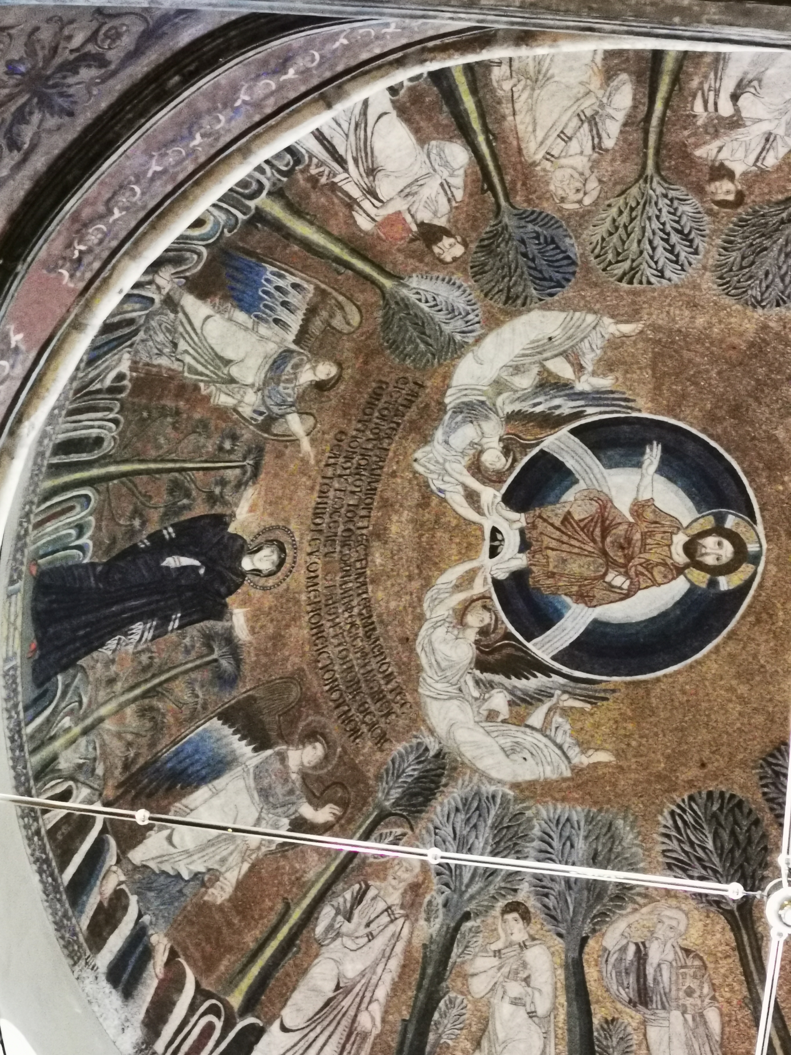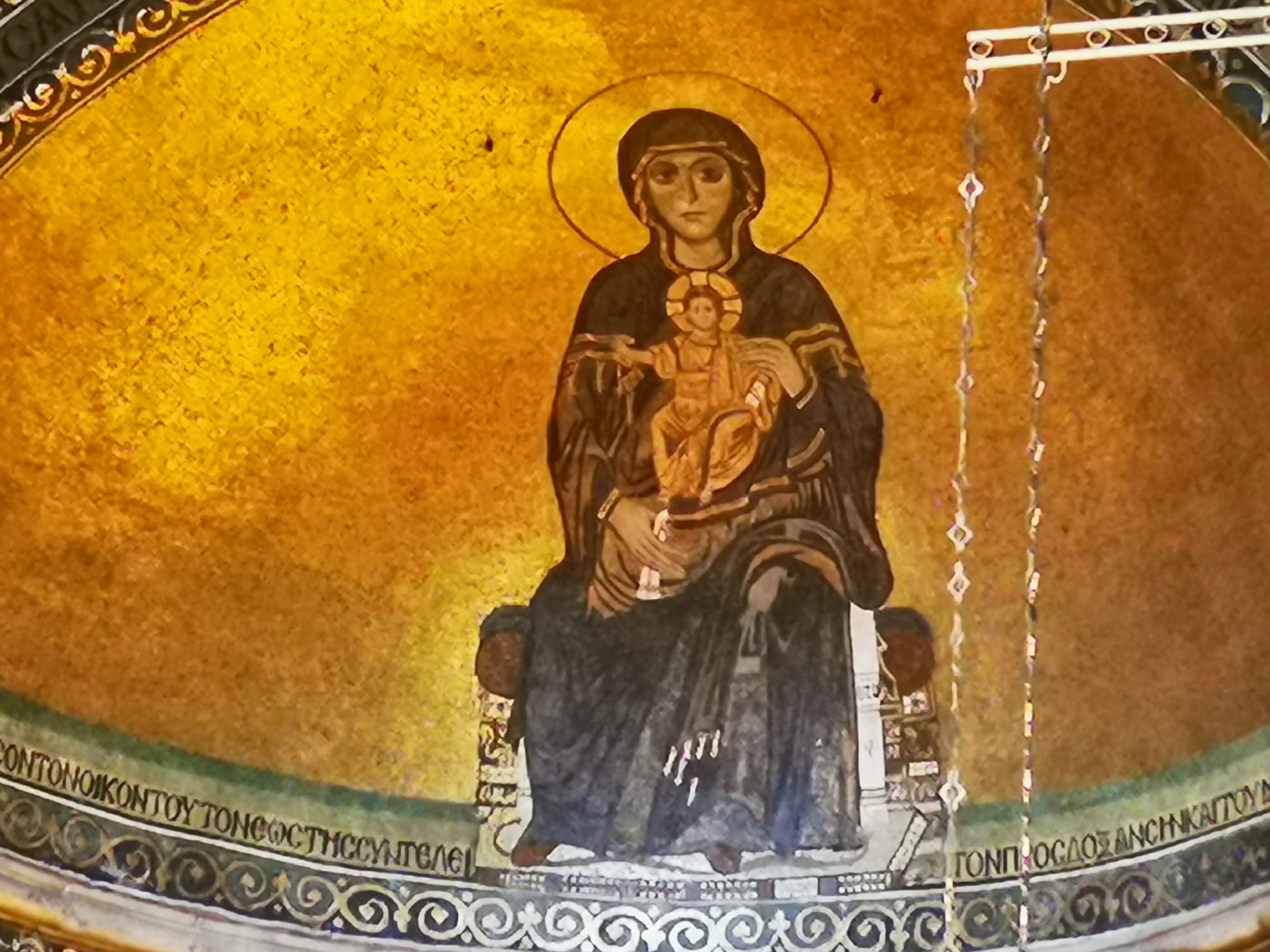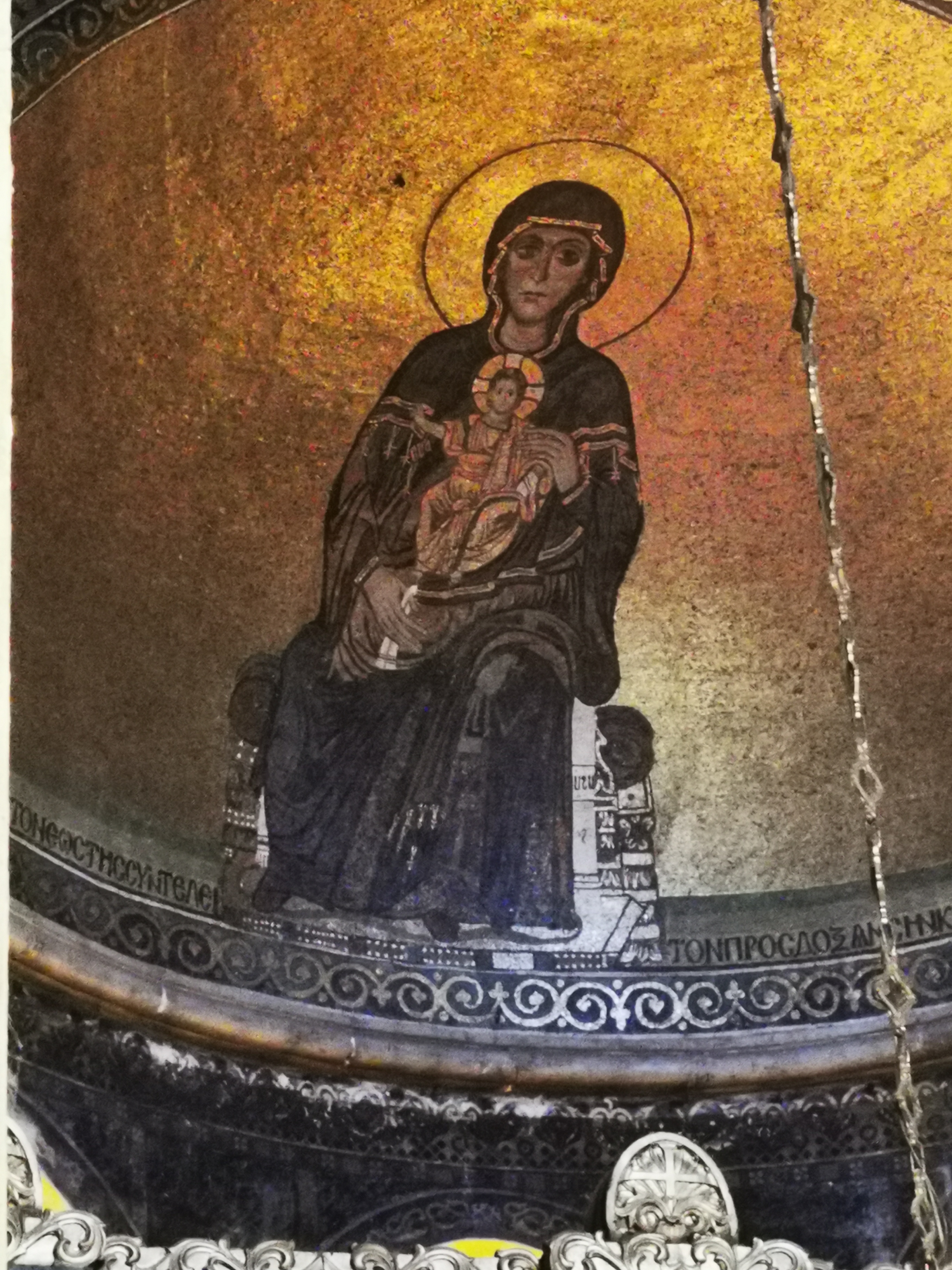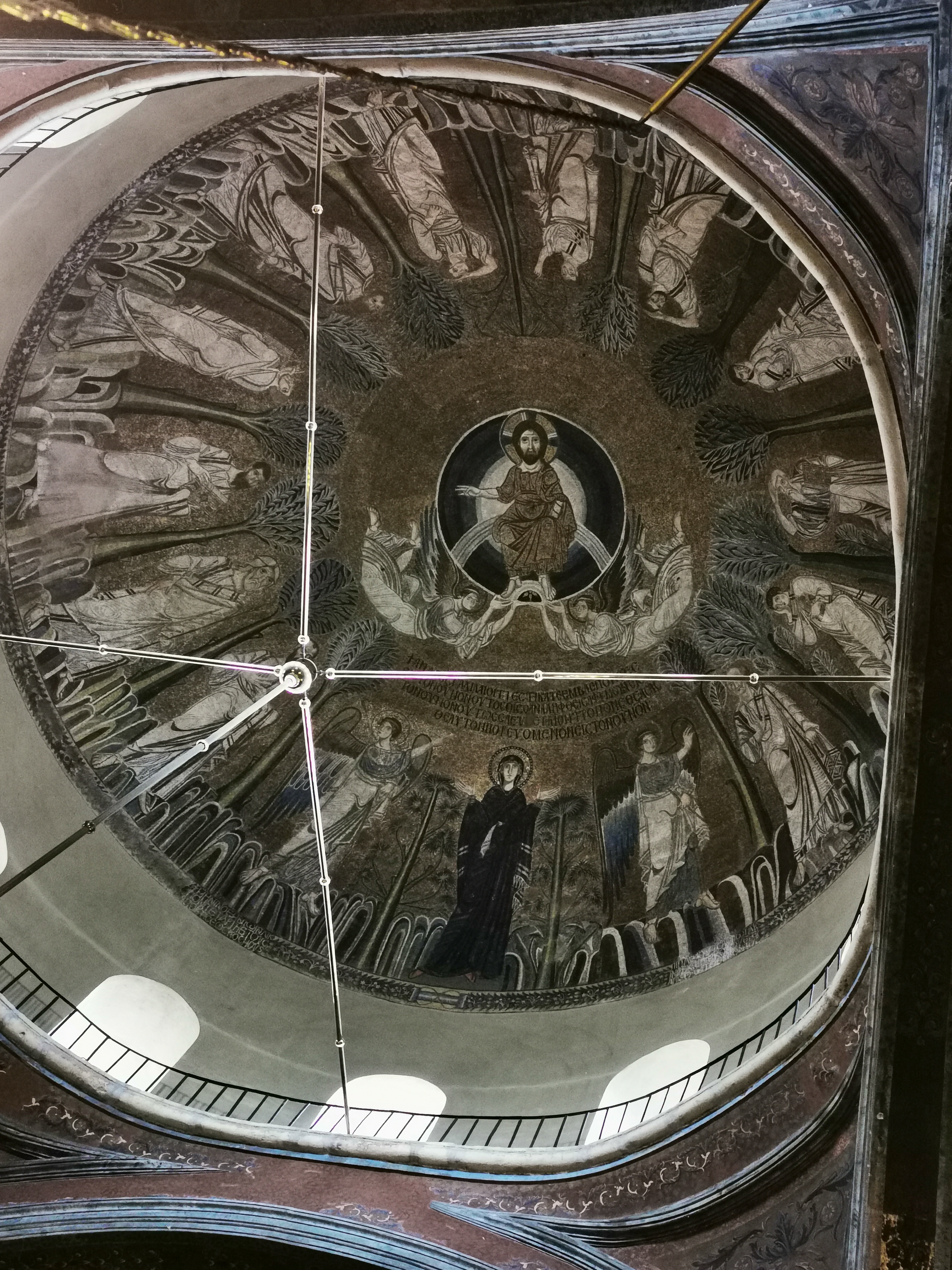 Visite de plusieurs églises aujourd’hui. La Panaghia Chalkéon (ND des chaudronniers, c’est ce qu’on fabriquait alors dans le quartier), 2 bons mètres 50 sous le niveau du sol actuel. On lui a adjoint un jardin qui n’existait pas je crois il y a 30 ans. Les fresques sont non photographiables tant elles sont en mauvais état, mais le plan en carré parfait est intéressant. Puis Sainte Sophie, avec quelques fresques et mosaïques assez étranges car un peu lourdes