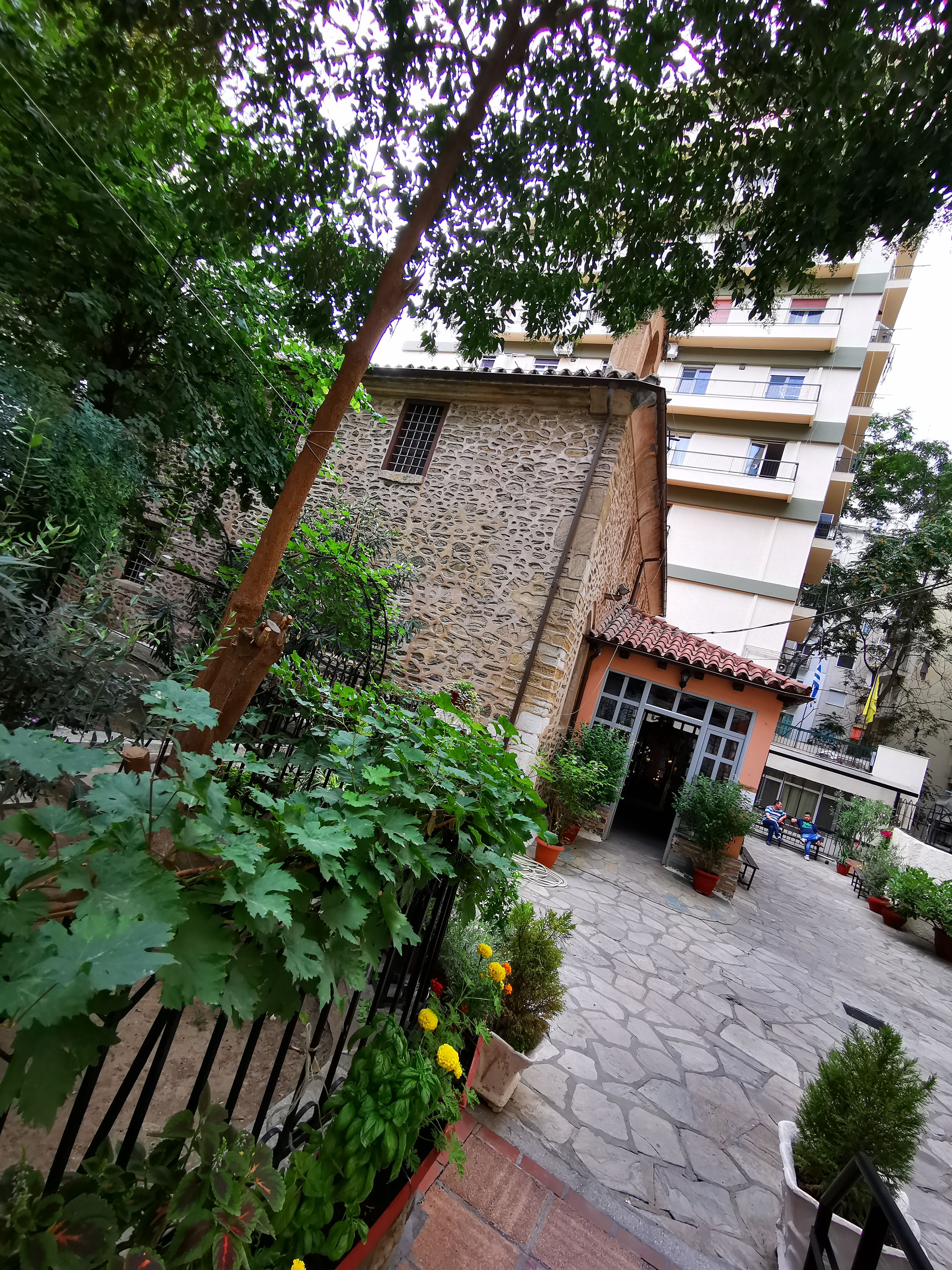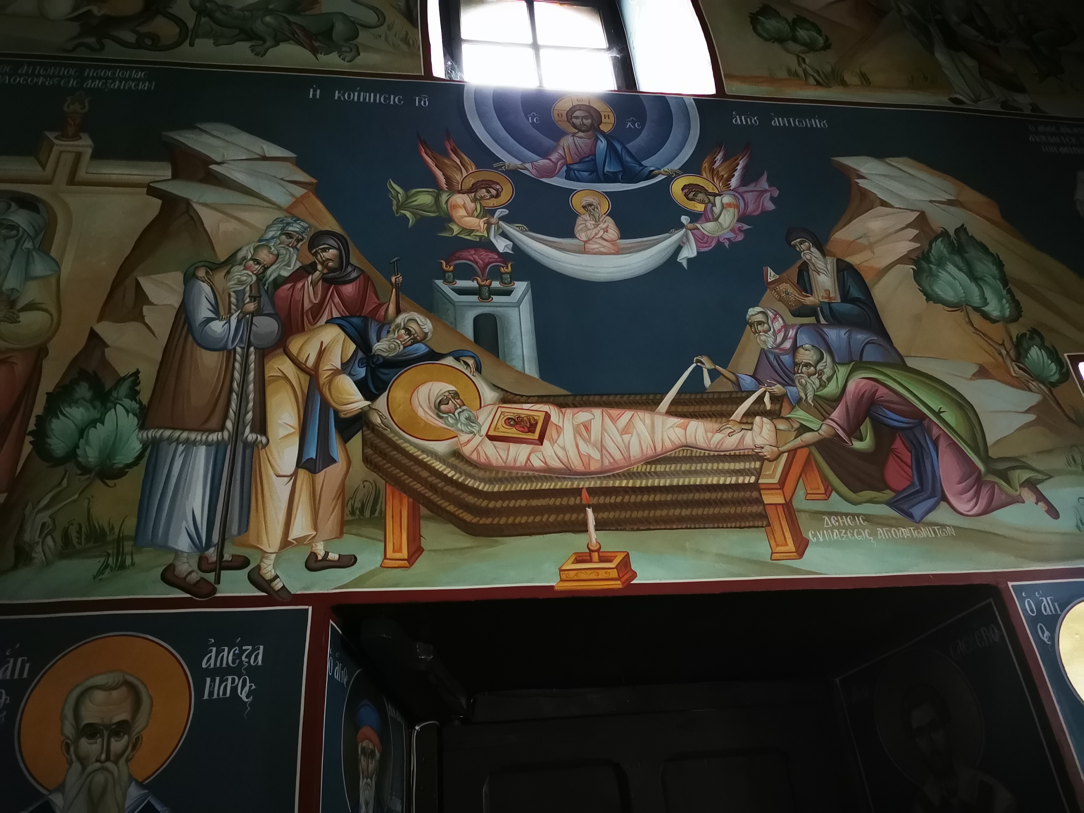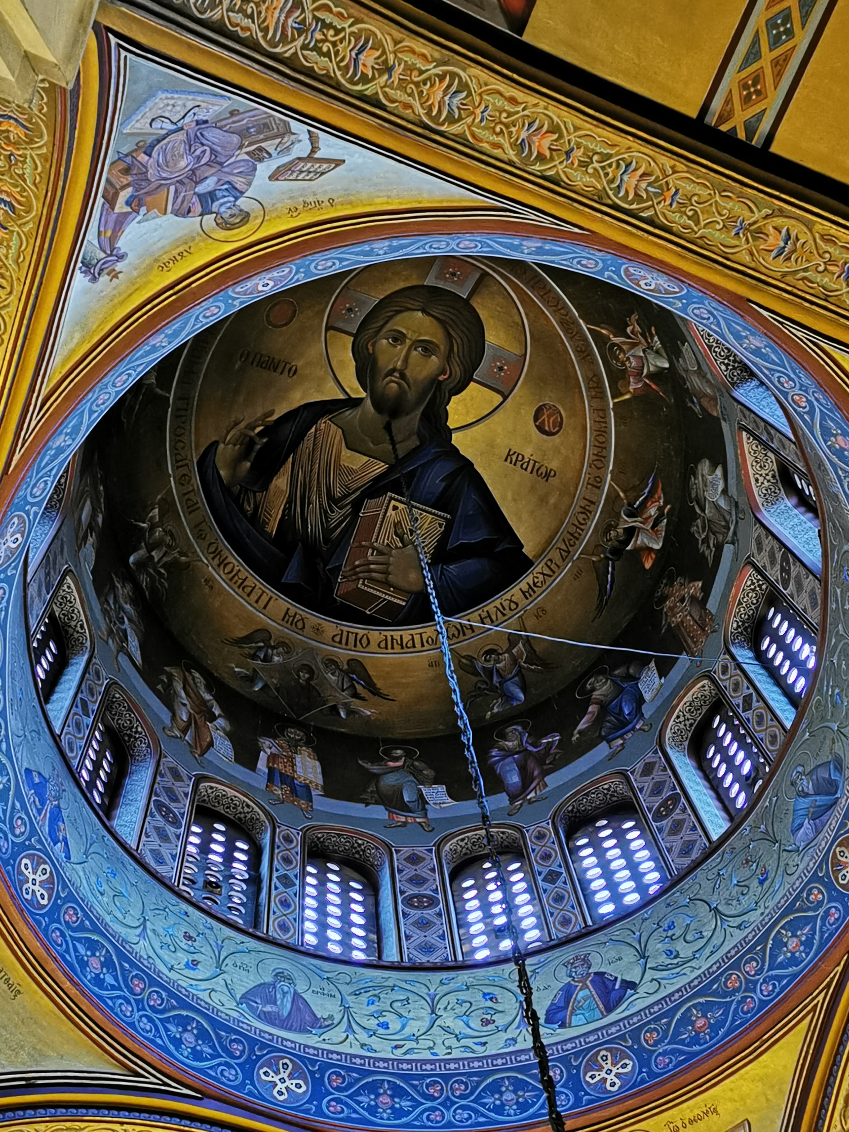 Retour par une minuscule chapelle Saint Antoine et la grande église de la Panaghia Dexia en face de l’arc de Galère. Les fresques sont modernes dans les deux cas, mais belles, et permettent de comprendre comment s’organise la décoration d’une église orthodoxe.