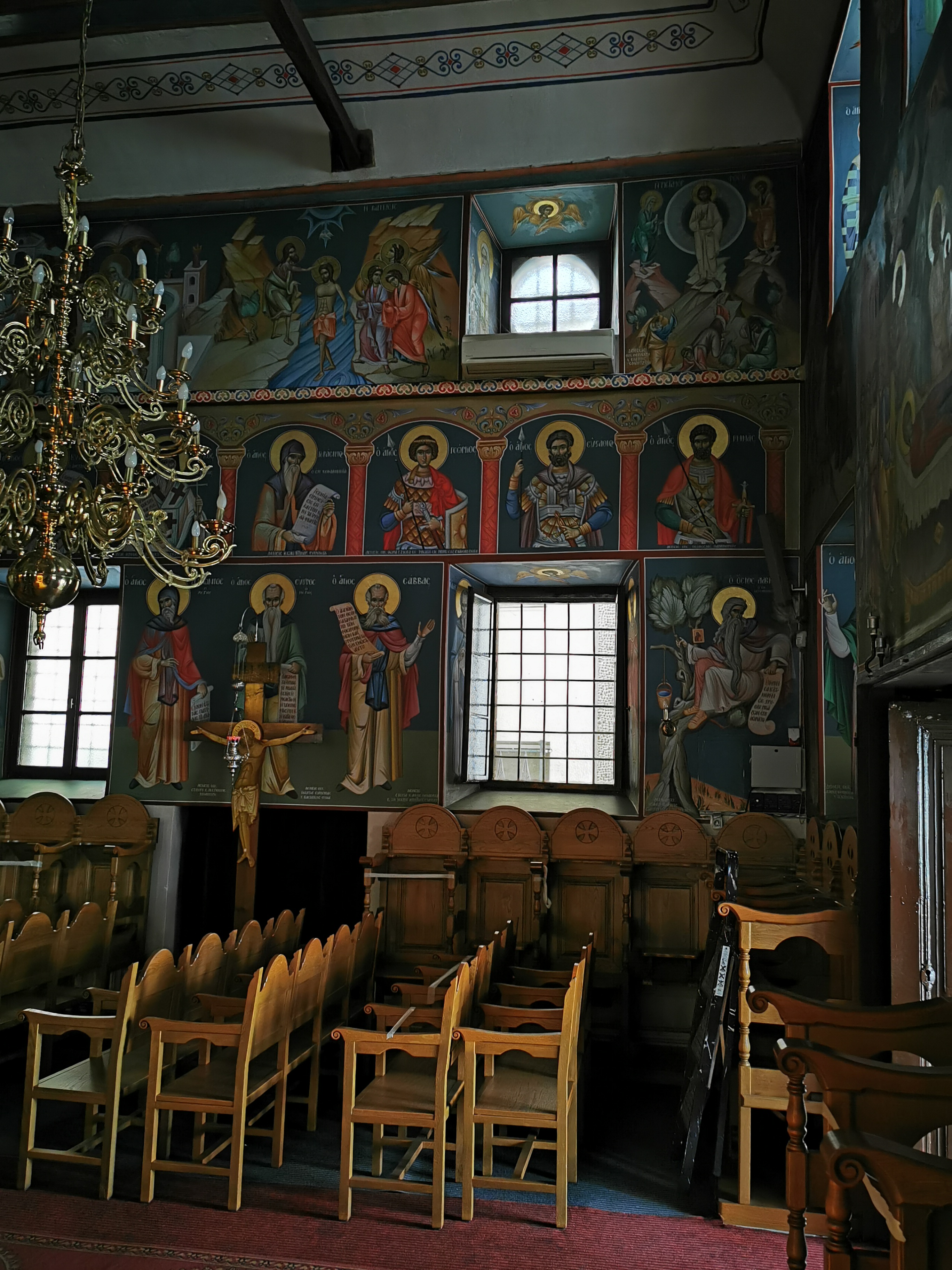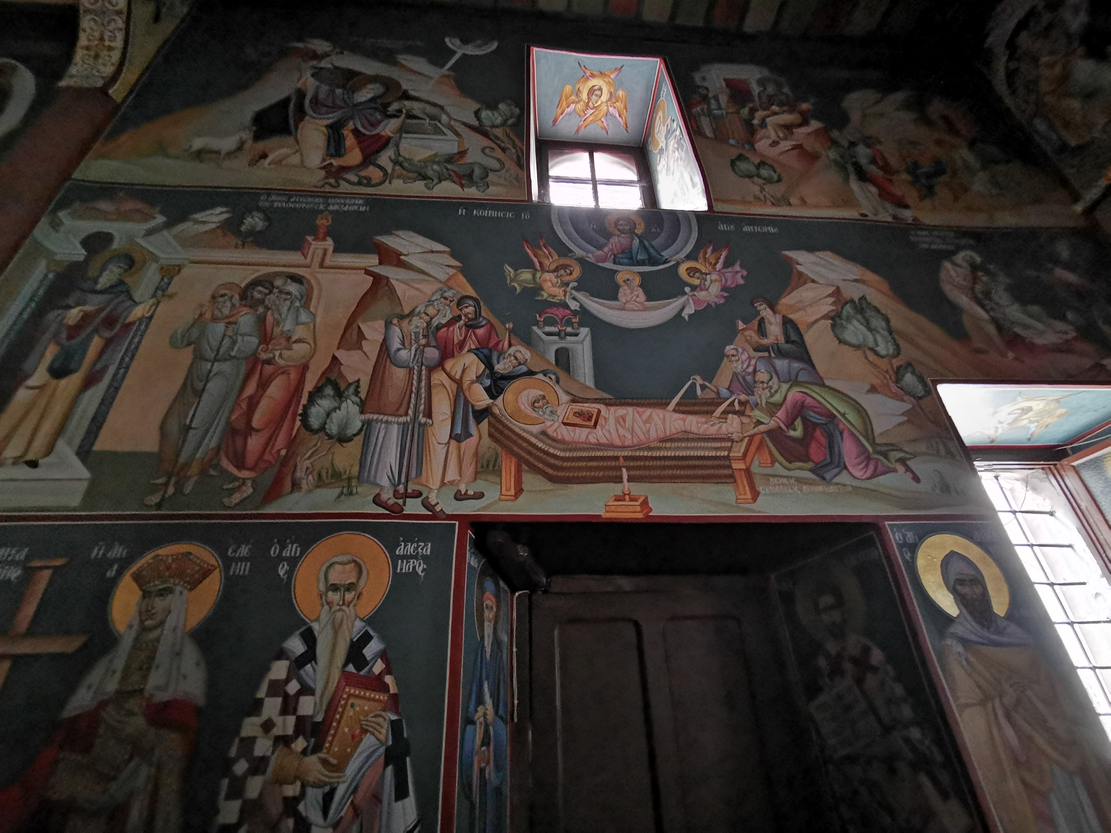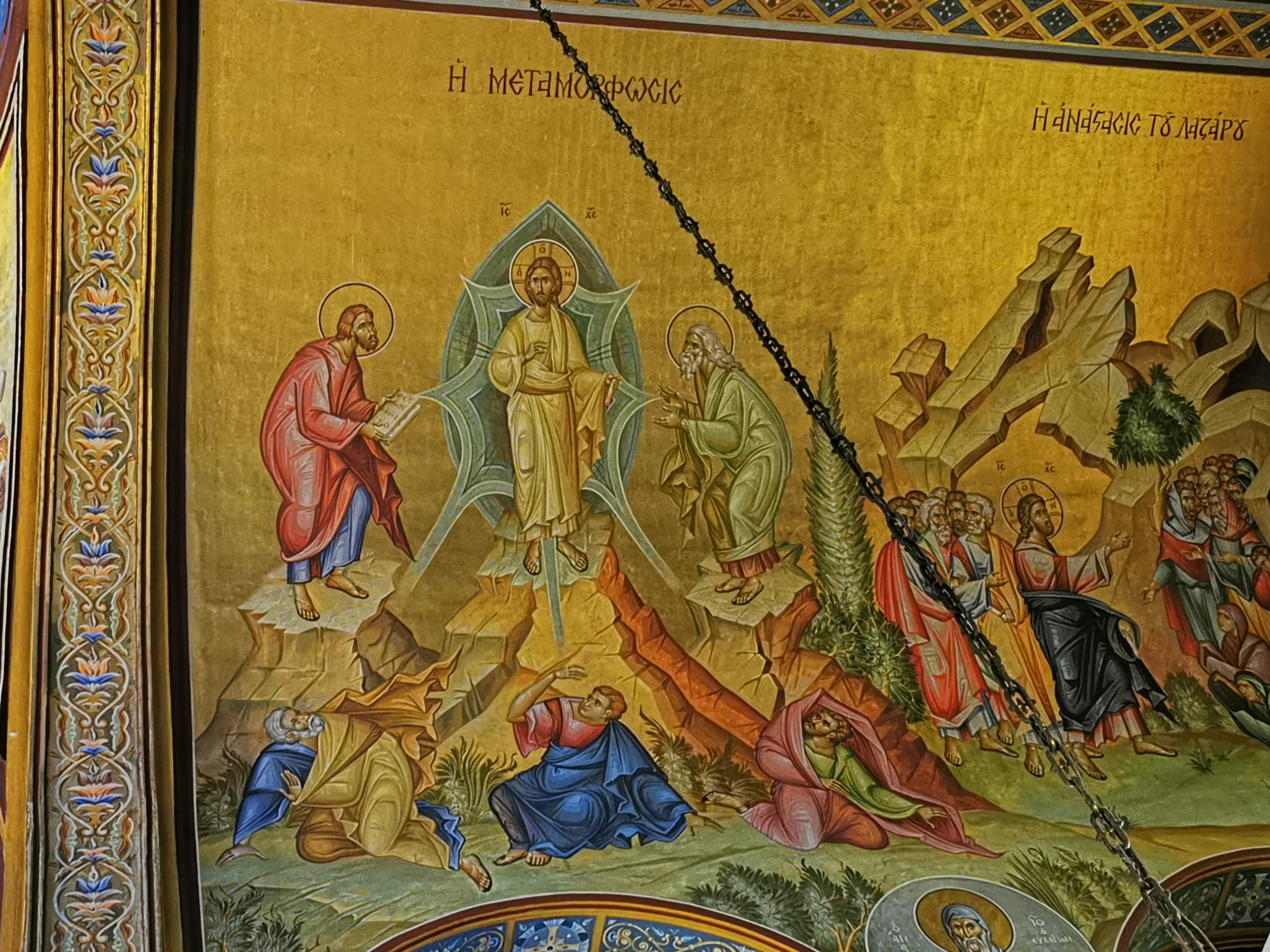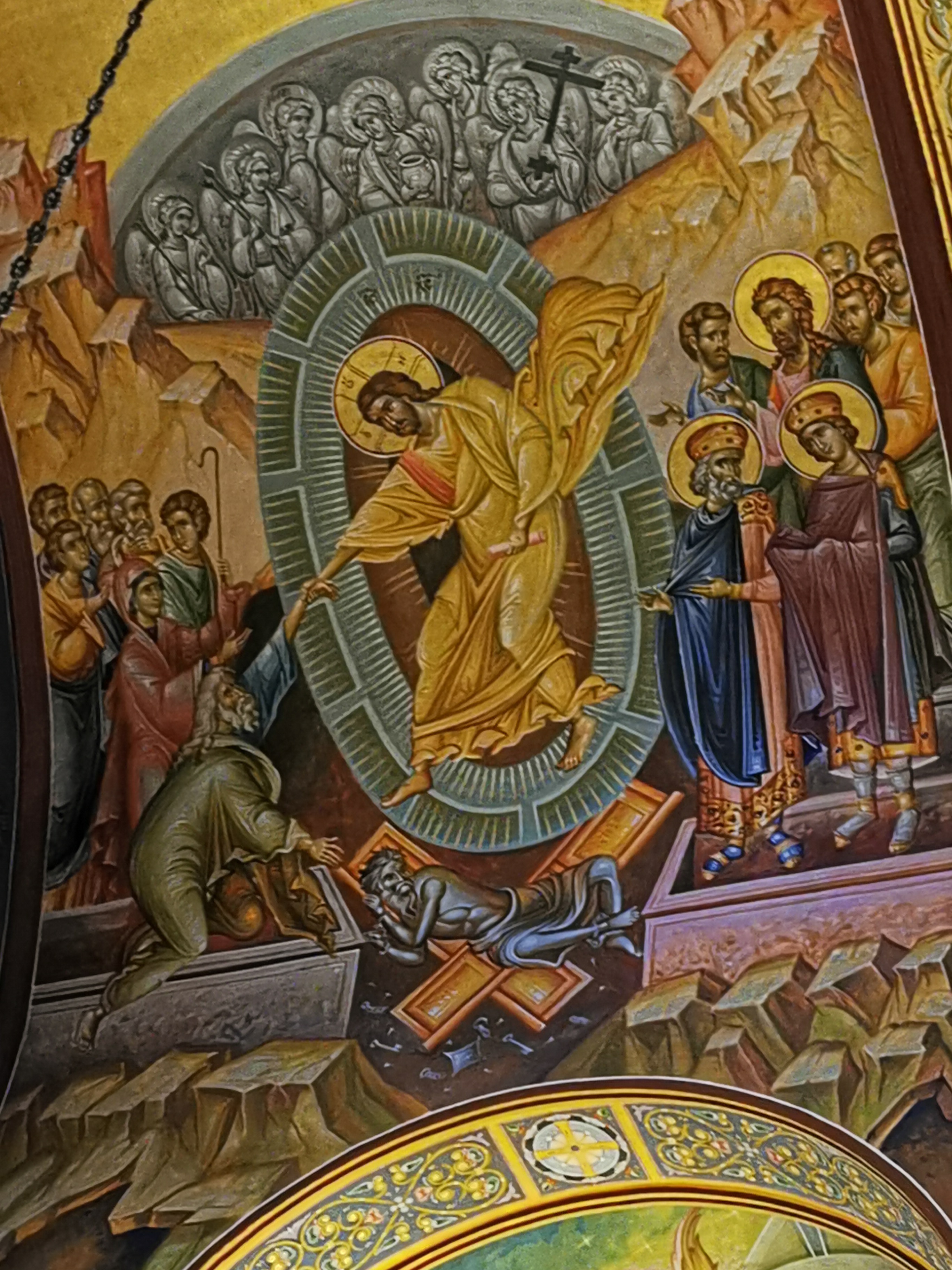 Retour par une minuscule chapelle Saint Antoine et la grande église de la Panaghia Dexia en face de l’arc de Galère. Les fresques sont modernes dans les deux cas, mais belles, et permettent de comprendre comment s’organise la décoration d’une église orthodoxe.