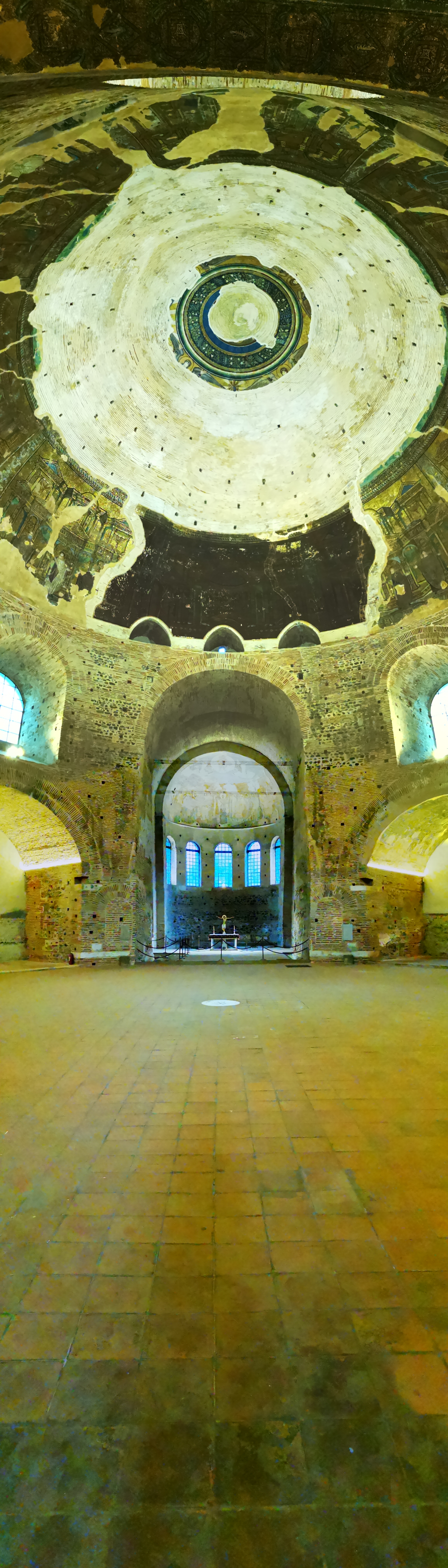 La fin de la journée sera à la Rotonde : ce monument fermé au public depuis 1978 fait partie du complexe monumental de l’empereur Galère (un immense palais, un cirque, un arc sur la via Egnatia, la Rotonde, prévue pour être le lieu de sa sépulture). Mais Galère mourra loin de Thessalonique, et Théodose transformera cet immense bâtiment octogonal (25 mètres de diamètre, 30 mètres sous coupole, acoustique incroyable) pour en faire, en ajoutant une abside plein est, la toute première église de la ville. Richement ornée, plaquée de marbre et couverte de mosaïques, dont il ne reste quasiment rien. L’église sera transformée en mosquée (on devine le mirhab et le minaret demeure), puis redeviendra une église après 1912.