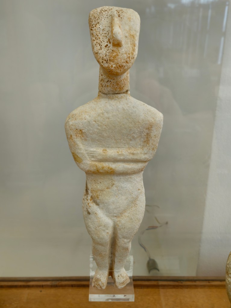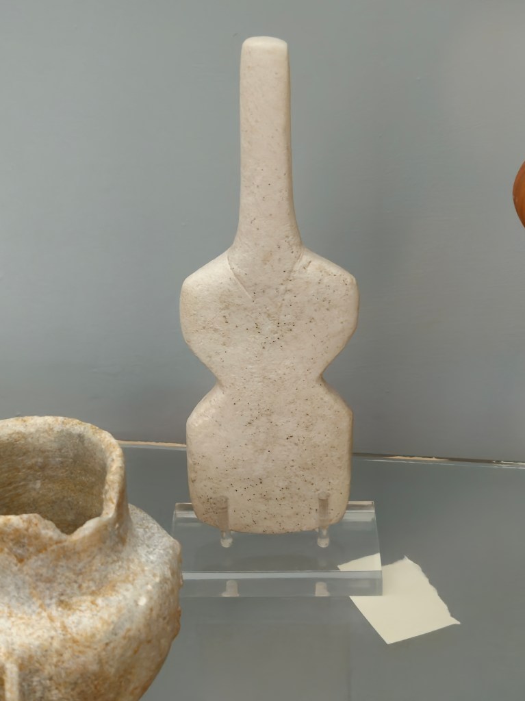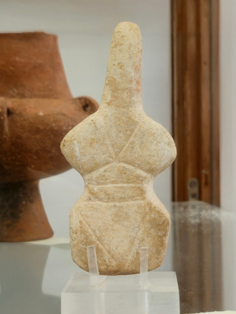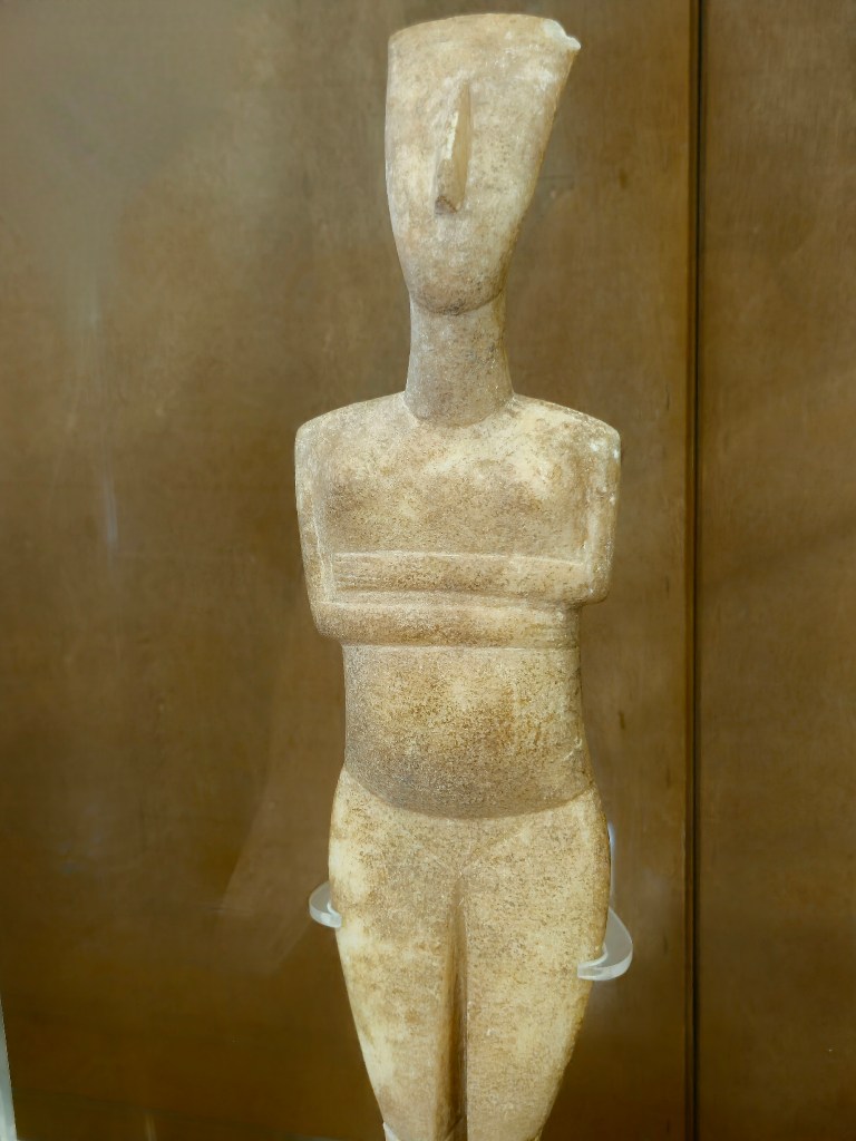 Journée tranquille à visiter Chora de fond en comble. Longue pause au musée archéologique, gratuit en cette saison. Muséographie totalement vétuste : objets entassés et quasiment aucune explication. Certes. Mais par contre, une vraiment très belle collection de statuettes cycladiques. Ces statuettes, de toutes tailles, restent encore aujourd’hui un mystère assez mal élucidé. Ce sont des objets préhistoriques par ailleurs d’une stupéfiante modernité, dans le sens où ils répondent au goût contemporain de l’épure. Préhistoriques puisque datés du néolithique. Pas d’écriture, on ne saura jamais rien des motivations des auteurs. Ce sont des statuettes en marbre, provenant des Cyclades, de Naxos, Amorgos et des petites Cyclades alentour. Elles représentent quasi essentiellement des femmes. Un premier type, sans jambes ni tête, qu’on appelle idole violon, et qu’on retrouve sous des formes diverses dans tout le croissant fertile. Un second type dit FAF, folded arms figurine, avec une convention : la statuette a les bras croisés, toujours le gauche au dessus du droit. Le sexe, triangle pubien, est toujours nettement dessiné. Toujours, la tête est légèrement renversée en arrière et les pieds tendus. Cette position a amené à s’interroger : les statuettes ne pouvaient tenir debout. On les a retrouvées couchées et quasi tout le temps en contexte funéraire. Certaines statuettes, connues en petit nombre sont extravagantes : un buveur, un joueur de lyre. On les voit au musée d’Athènes ou au Louvre. Ici, on n’en verra que de plus classiques mais avec de nombreux détails intéressants : une femme visiblement enceinte. Une autre au ventre plissé comme après un accouchement. Une autre encore qui frotte malicieusement ses pieds. Dans tous les cas, quelle modernité. Et quelle technique il fallait pour arriver à tirer du marbre, matériau dur, des formes aussi rigoureusement géométriques.
