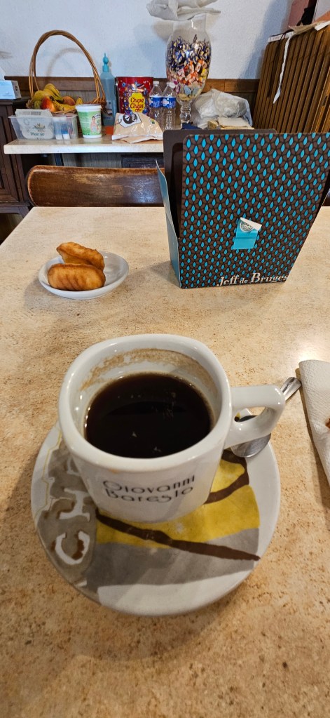 Je commande un café allongé, qu’on me sert avec 3 madeleines et une boîte de chocolats Jeff de Bruges, je suis amusée, et touchée !