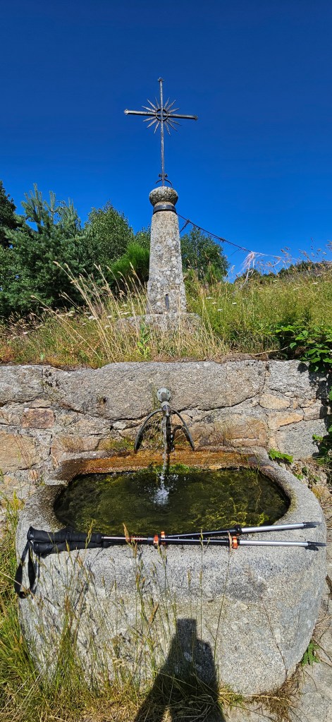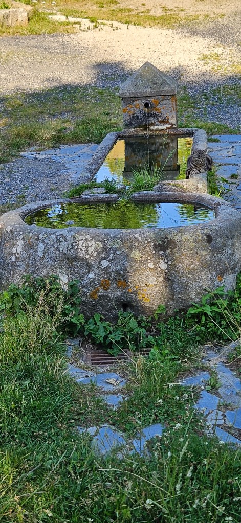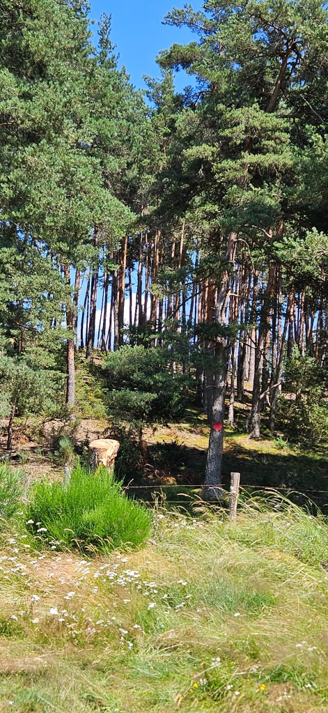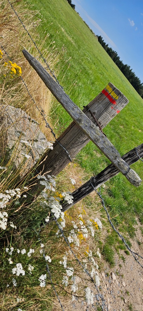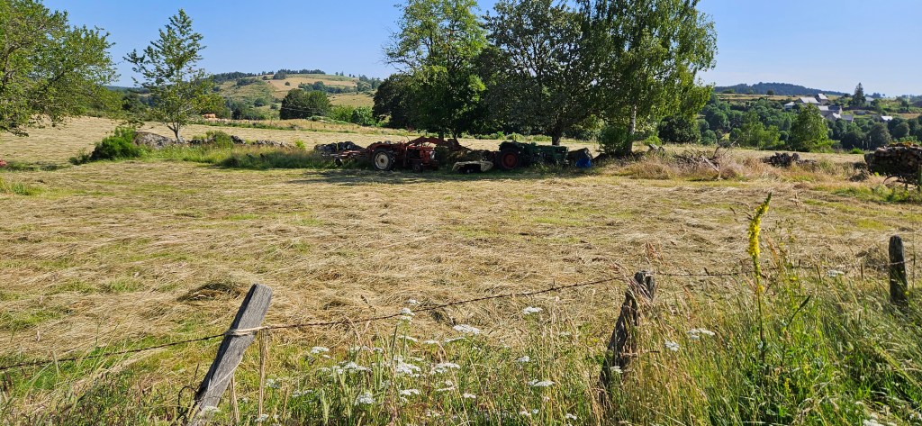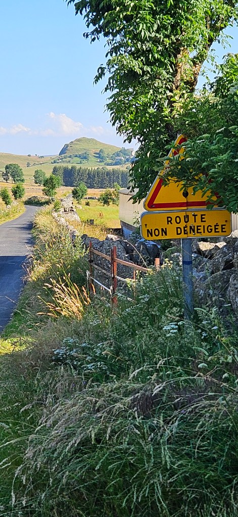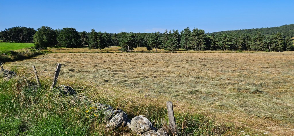 C’est le retour sous ce qui commence à être pour l’Aubrac une vraie canicule. Les nuits restent fraîches, mais les 33 à 34 degrés de la journée sont ressentis au-delà. Le blé est toujours vert, mais les agriculteurs s’activent vraiment pour les foins, sous la chaleur ou en soirée. Petit à petit, le chemin quitte les estives et les hauts pâturages pour des paysages plus boisés de pins évoquant la remontée vers la Margeride. Passage à Fournels où la fête bat son plein. Passage à Fau de Peyre et son formidable restaurant campagnard. Le chemin a très souvent les monts du Cantal en ligne de mire, c’est tout près.