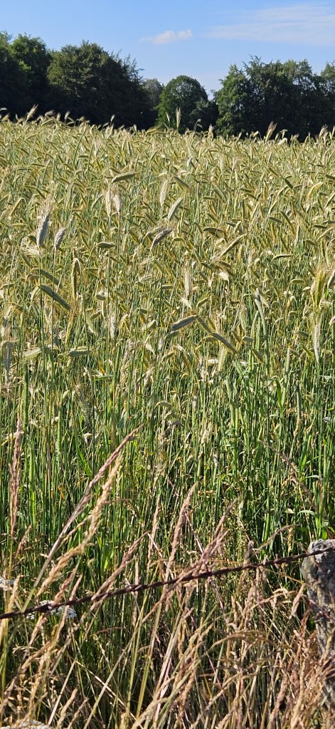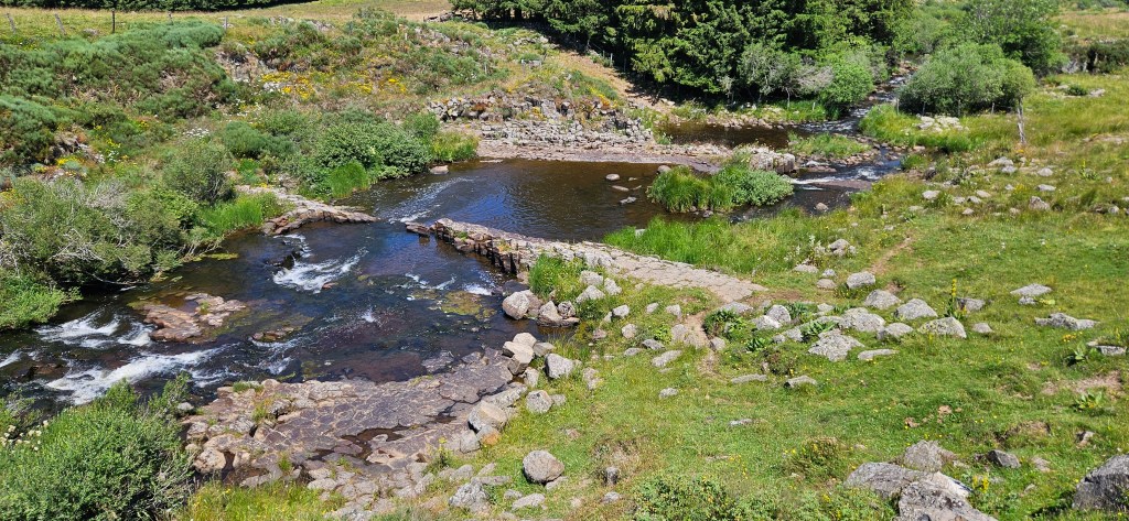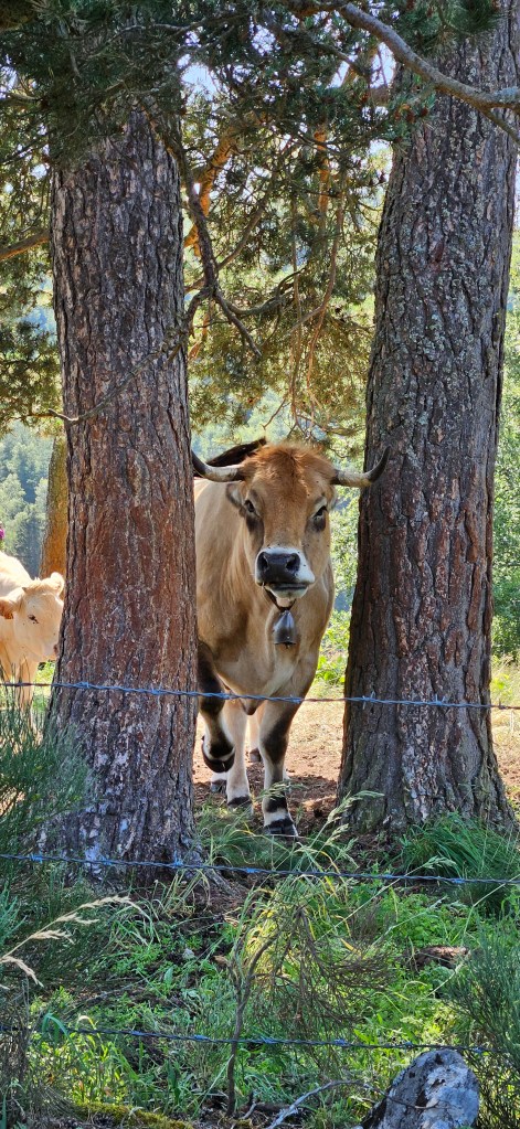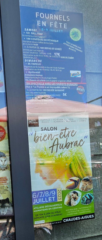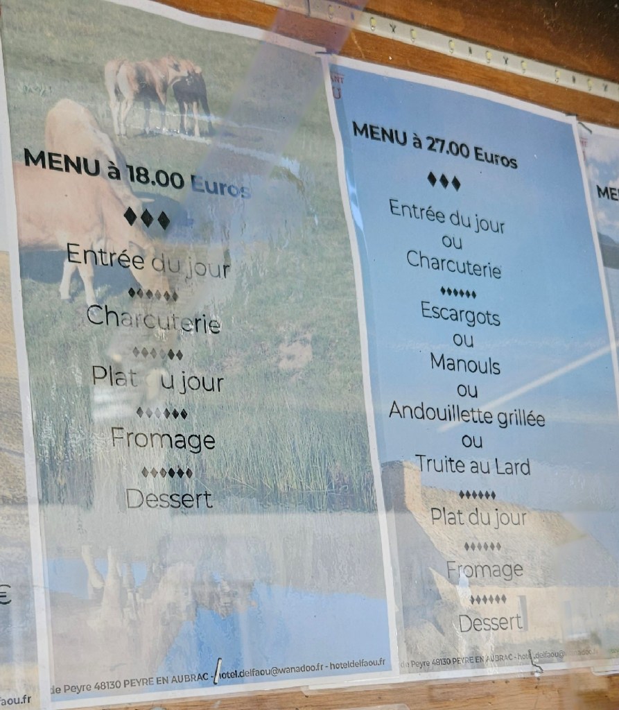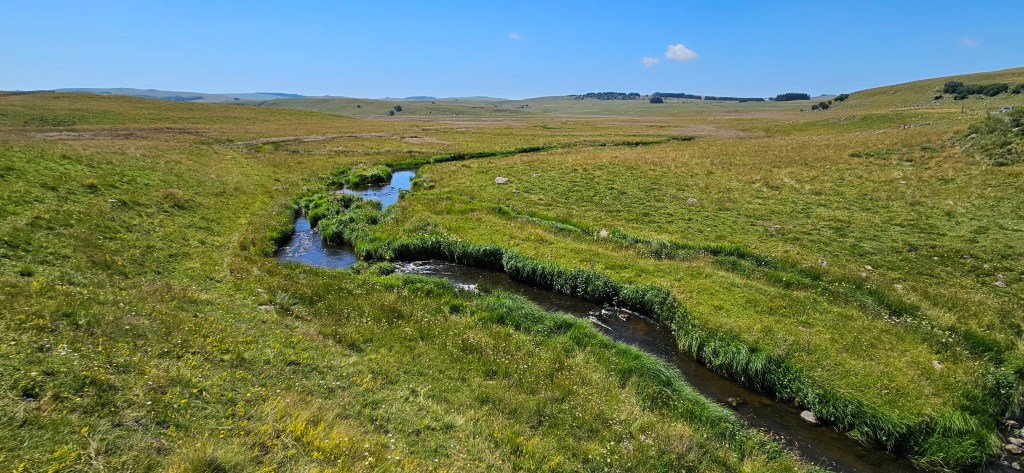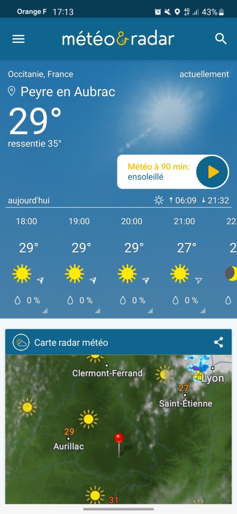 C’est le retour sous ce qui commence à être pour l’Aubrac une vraie canicule. Les nuits restent fraîches, mais les 33 à 34 degrés de la journée sont ressentis au-delà. Le blé est toujours vert, mais les agriculteurs s’activent vraiment pour les foins, sous la chaleur ou en soirée. Petit à petit, le chemin quitte les estives et les hauts pâturages pour des paysages plus boisés de pins évoquant la remontée vers la Margeride. Passage à Fournels où la fête bat son plein. Passage à Fau de Peyre et son formidable restaurant campagnard. Le chemin a très souvent les monts du Cantal en ligne de mire, c’est tout près.