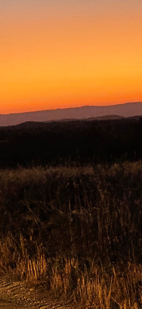 Arrivée sur le plateau puis à Saint Sauveur avec une lumière surnaturelle pour ici, typique d’un crépuscule sahélien. L’herbe sèche est jaune intense sur fond de nuit tandis que sur l’horizon les pins se découpent sur un ciel orange. Le temps d’arriver, il sera devenu quasiment violet.